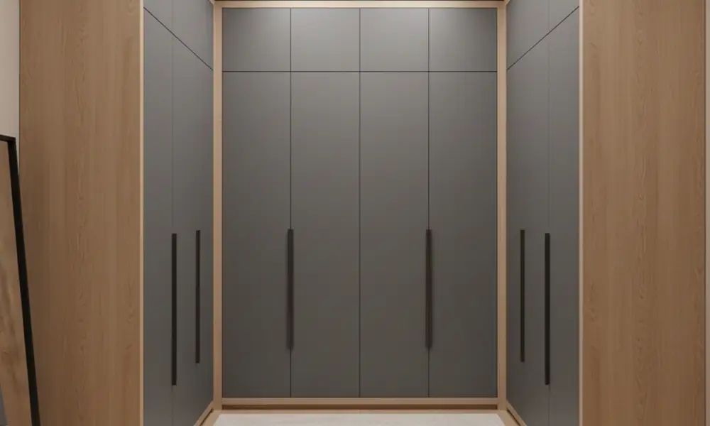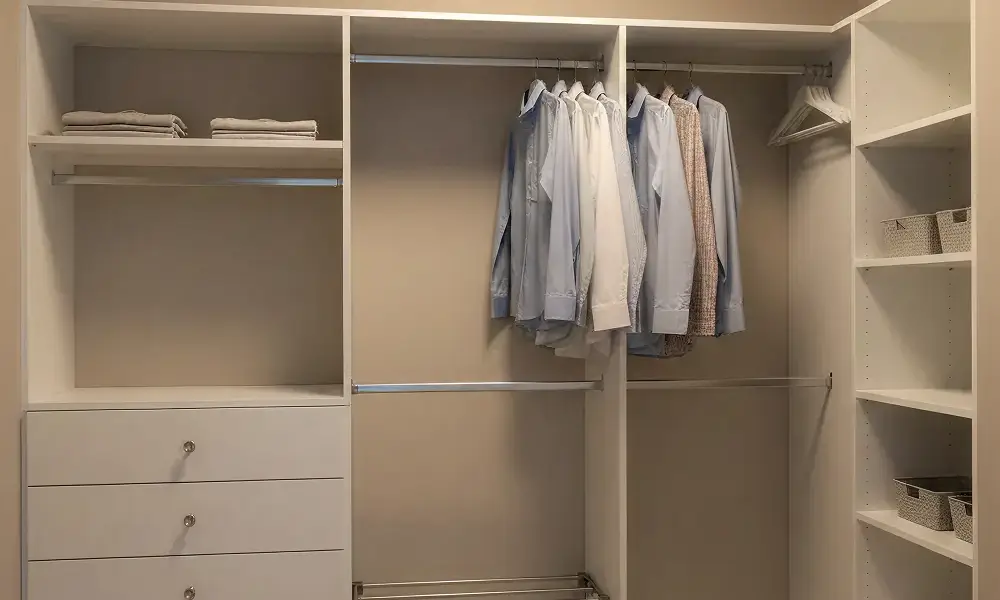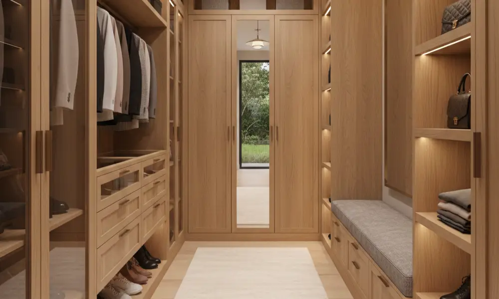 Esse modelo funciona bem tanto em ambientes médios quanto em closet pequeno, sendo comum em suítes e dormitórios onde não há espaço suficiente para um closet em U. A organização costuma ser eficiente, desde que a distribuição interna seja bem planejada.