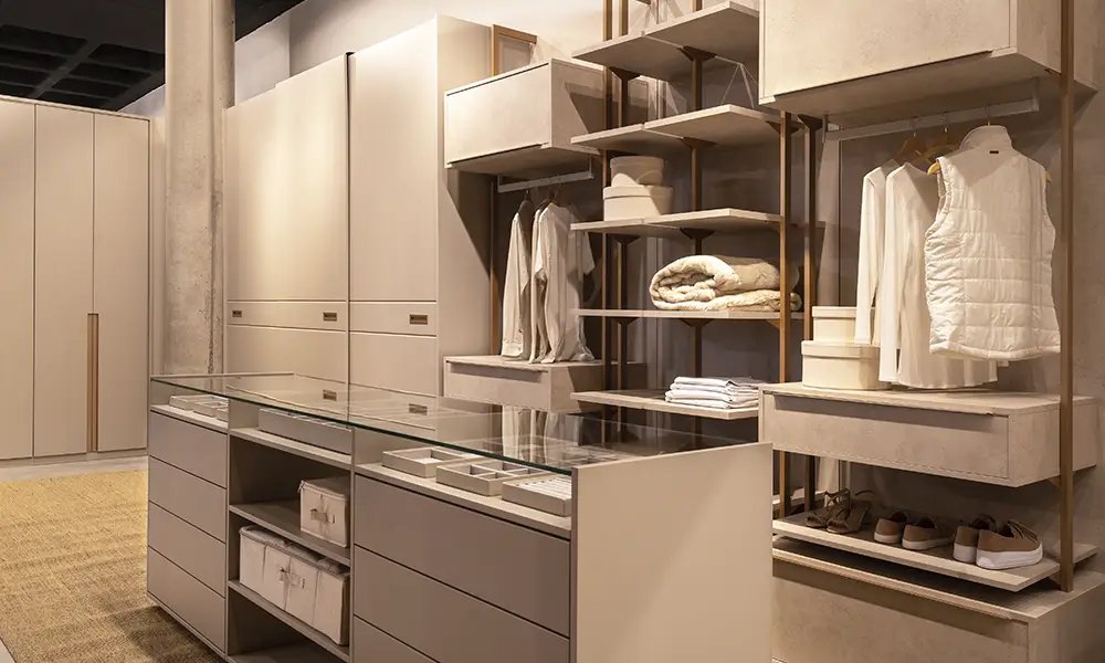 O closet clean se destaca pela neutralidade visual e sensação de ordem. Cores claras, poucos contrastes e superfícies contínuas criam ambiente leve, organizado e fácil de manter.