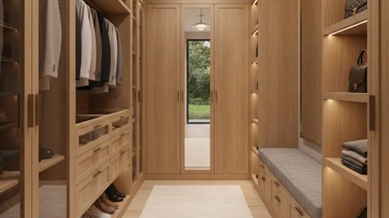 O closet em madeira clara transmite leveza, amplia visualmente o ambiente e funciona bem em espaços pequenos ou com iluminação natural limitada. É uma escolha frequente em projetos contemporâneos e em closets integrados ao dormitório.